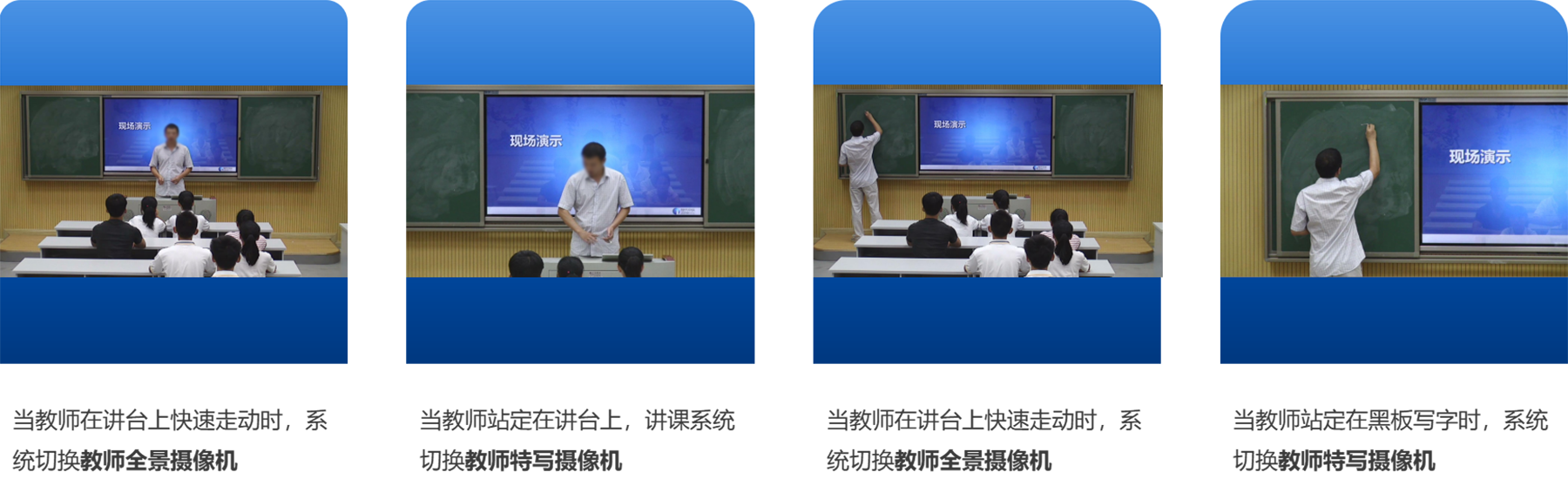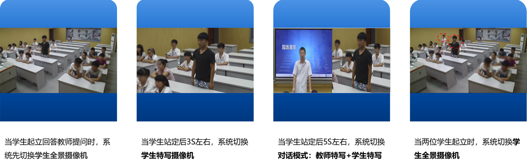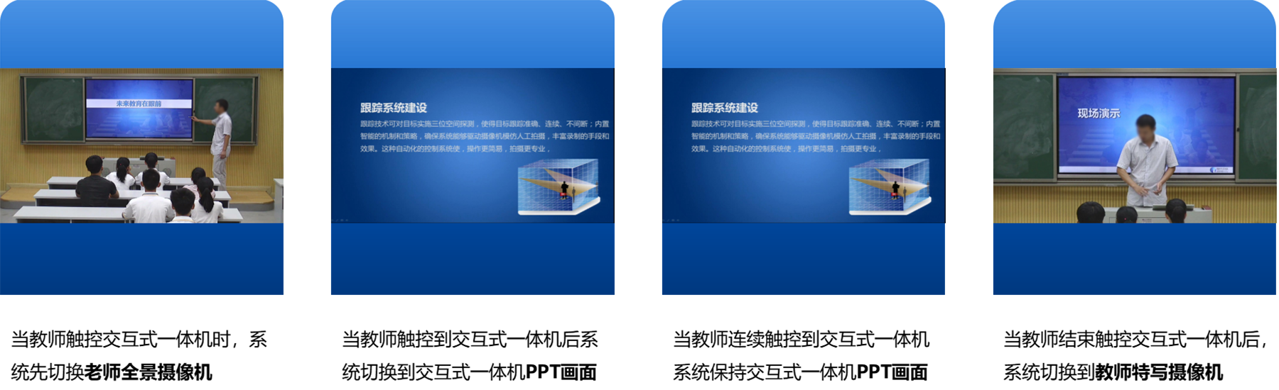 • 支持人脸识别,识别人脸轮廓,检测活动目标。采用三维图像复合图像识别分析算法,能够智能判断教师、学生的行为及动作,用独立专用的跟踪探测设备进行3D景深数据的采集,可分别对老师、学生和板书进行独立跟踪。