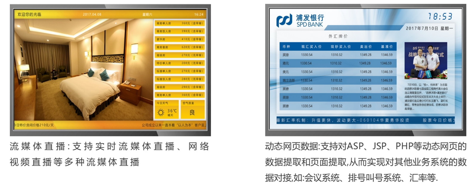 多媒体信息发布系统默认支持常见的音频、视频、图片、文档格式的素材.同时为满足各行业针对多媒体信息发布系统的兼容拓展需求,开放数据对接接口,实现对第三方系统的对接和拓展需求: