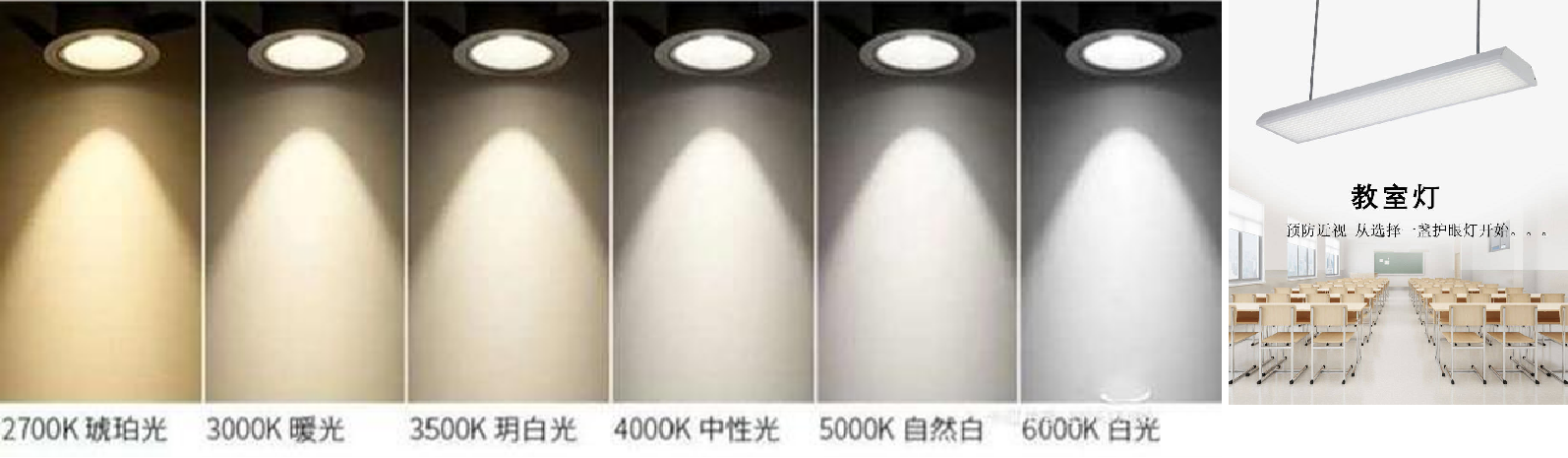 Ø 灯具选择白色或自然光色(色温范围在5000K6500K),这样可以提供最清晰、最接近自然光的效果,有助于学生视觉的舒适和保护。