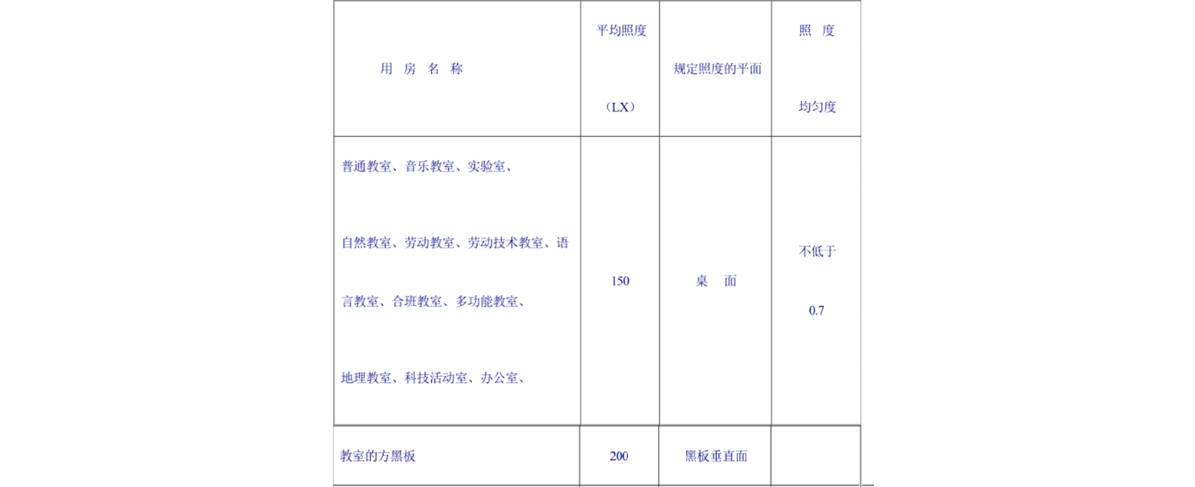 6、照明教学、办公用房应采用配用保护角灯罩的荧光灯具,不得用裸灯。教学用房照明灯具的数量、功率、布置方式和悬挂高度必须满足照度均匀度的要求,达到规定的照度标准。灯具悬挂高度距桌面不应低于1700mm