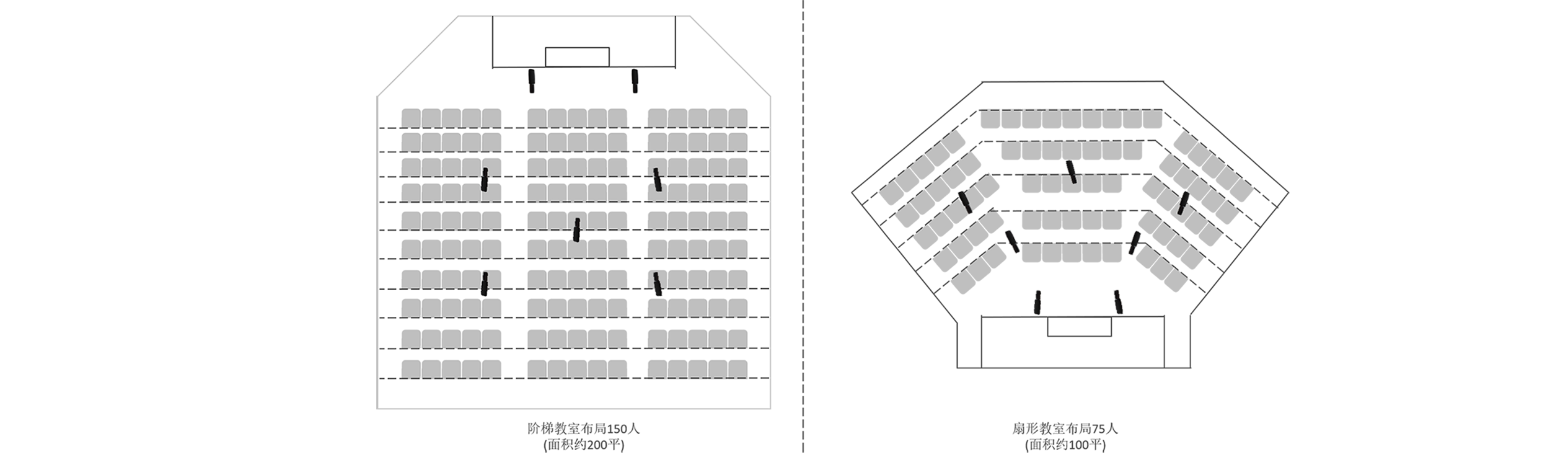 4、多功能教室、合班教室、体育活动室等公共教学用房的层高可根据使用要求确定。阶梯教室最后一排的地面到棚顶的净高不应小于2200mm